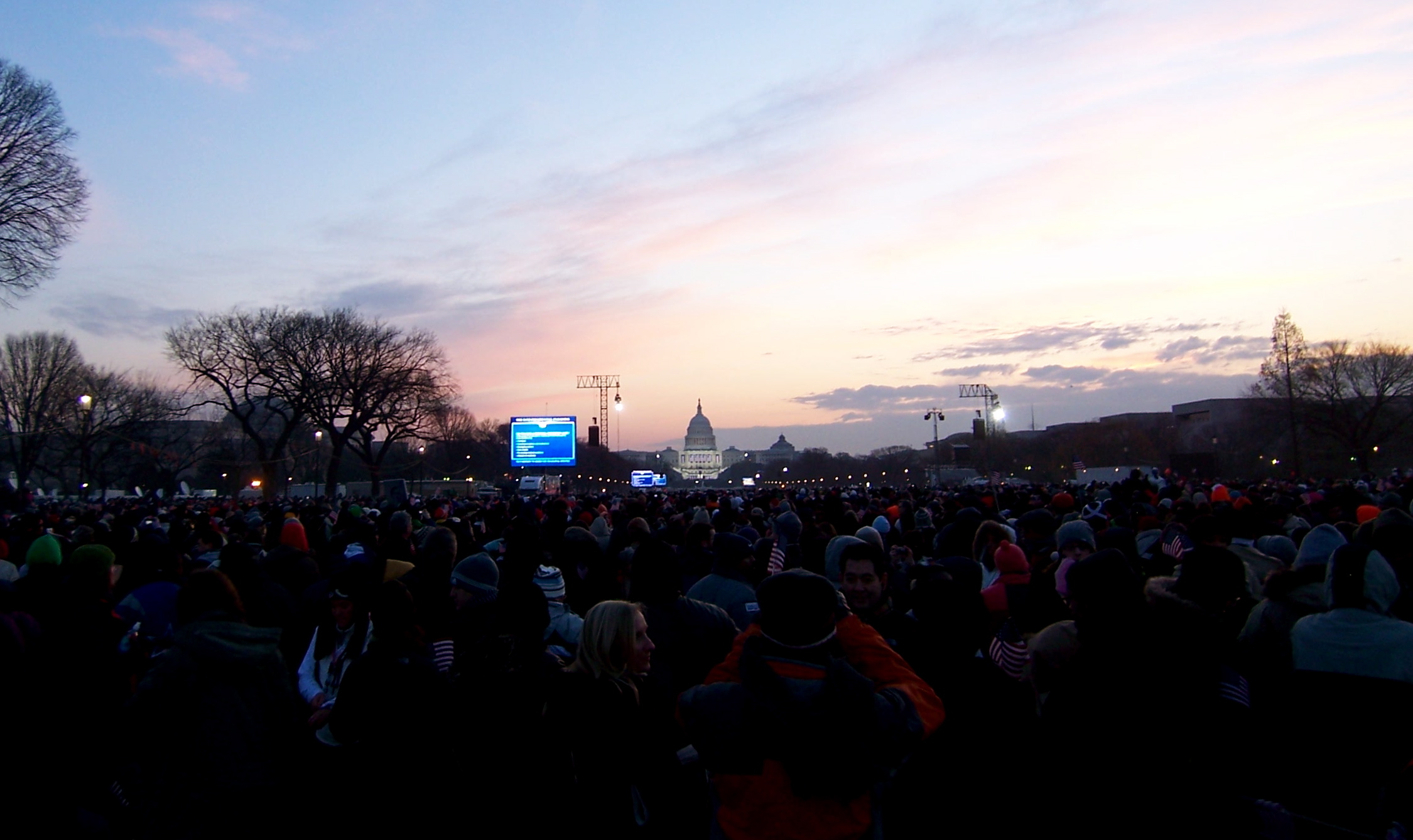 Our bus was filled with people of many colors, from all over the world. I sat next to a woman named Kimberly, who owns a crisis management consulting business in Alabama. As we talked, we recognized in one another a kindred spirit; our lives couldn’t be more different, yet we both longed for a restoration of hope and stature for our country, and for a renewed call to sacrifice and service for the common good. It turned out that Kimberly brought many of her family along from all over the country – her mother said that she couldn’t remember a similar atmosphere of “electric anticipation,” even when JFK had been elected. The roads outside our windows were packed with cars, and traffic moved quite slowly; still, there was barely a horn honked or an angry face to be seen.