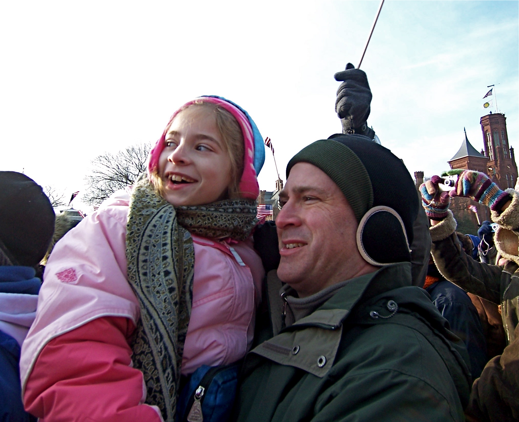 As the VIPs started to arrive, we watched them on the screens. Cameras were set up along the route and in the Capitol (the next day we were able to see many of the cameras still rigged on the path they had walked through the building.) To my dismay, many “booed” the Bushes and a few others – these were among the few “off” moments in an otherwise joyful day. People around us were talking about the various politicians they’d met as we saw them on the screens; Sarah was disappointed that I’d never met anyone we were seeing until Yo-Yo Ma and Itzhak Perlman performed right before the President was sworn in. When I told her I’d met both of them (“In person, for real?” “Yes, in person.”) she was satisfied that I wasn’t a complete nobody.