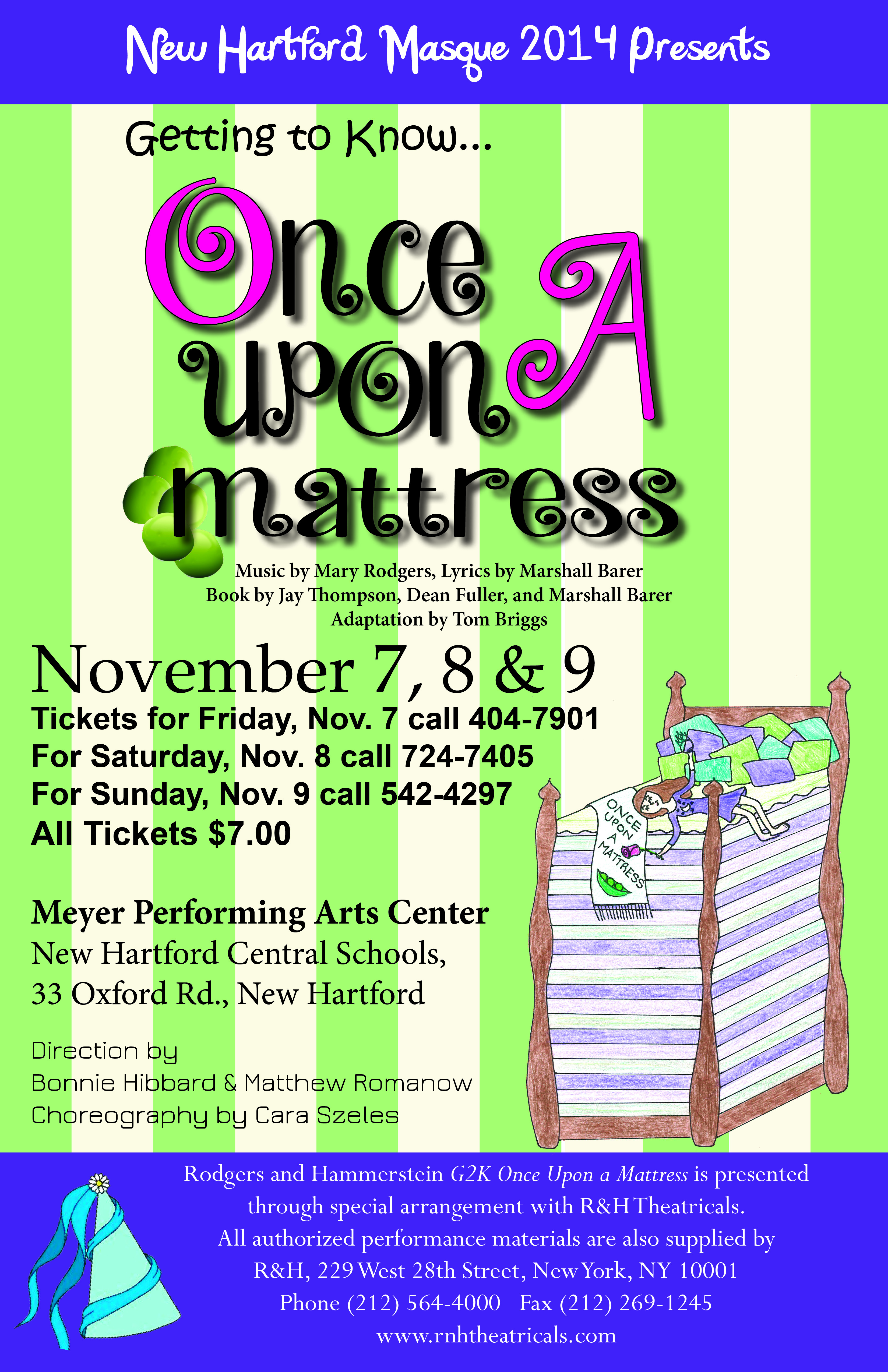 If you’re in the greater Utica area and have an hour to spare this afternoon, I highly recommend you stop over to New Hartford HS for the Jr. High production of Once Upon a Mattress. Ashley Pope effortlessly holds the stage and everyone’s attention with a gently goofy take on Princess Winnifred that channels Carol Burnett and a bygone era of unironic comediennes. Her performance is one of those rare “aha” moments that makes enduring dozens of duds worthwhile. I enjoyed every moment she was on stage; the fact that she also seemed to be enjoying herself, and not at the audience’s expense, certainly added to our delight. In particular, she has a great time with the musical number Shy, throwing herself and her voice around to great comic effect. Habeeb El-amir is a terrific foil, looking completely smitten (he’s the audience surrogate) and always game for a pratfall. He never upstages Ashley, instead putting her on a pedestal and committing entirely to his bits – he doesn’t just fall, he slides face-first across the stage (it’s kind of amazing.) Ashley get close to brilliance in the scene where she’s given a sleeping potion and increasingly loses control of her limbs and her voice; she tops that when she finally gets on the titular mattress and can’t fall asleep. Her spasms were increasingly inventive, the kind of physical humor that can’t be taught – you either have the instincts and the timing or you don’t. Seriously, see Ashley Pope in this. It’s a cliche to say “a star is born,” but sometimes, very rarely, that’s exactly what happens.