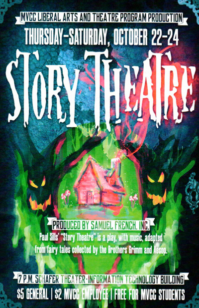 That perspective is kind of mind-bending, as I sort out my reactions to MVCC’s production of Sills’ piece; if the creative team had a political imperative (how timely!) it wasn’t evident at last night’s performance. That’s not to say the presentation wasn’t enjoyable on its own terms – the troupe displayed a variety of performance craft, much of it impressive and well-coordinated. I expected morals (or at least modern twists) in the re-tellings of Grimm and Aesop stories, but the individual parts seemed designed to subvert anticipation; most ended abruptly, without punctuation.