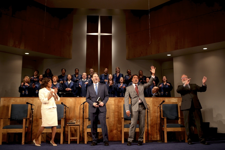 The associate pastor stands and challenges the pastor’s doctrinal assertions. They duel, a Scriptural face-off that plays like a battle of sorts. Hnath begins to let us inside Pastor Paul’s head, while the action continues in real time. This is one sequence where director Tim Bond doesn’t do enough – the nature of the intellectual face-off and the pastor’s asides cry out for theatrical artifice, which Bond doesn’t provide. In fact, Bond’s efforts to maximize the realism of the church setting overlook how theatrical liturgy is to begin with; for example, a congregation with the economic resources implied by the script would illuminate and amplify its choir more theatrically. (The one concession to artifice is that every character uses a handheld, wired microphone when speaking, even during scenes not set in the church – it’s effective at showing how every interaction is in some way a public proclamation; the characters are always delivering their testimonies.)