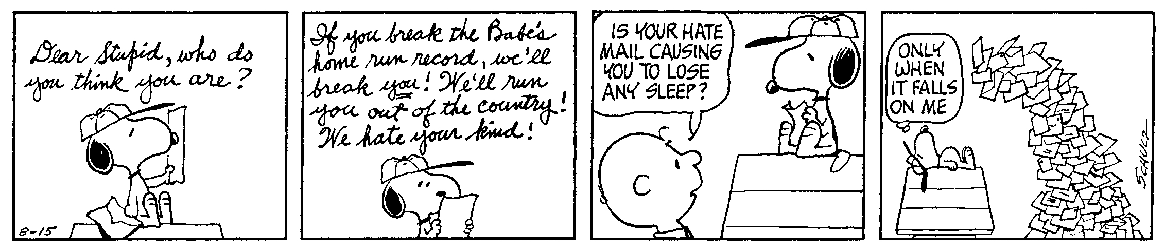 Charles M. Schulz served in the Army during World War II. He was proud of his service, but he was also more socially progressive than Weatherford remembers. In 1968, Schulz introduced a black character named Franklin after a correspondence with Los Angeles schoolteacher Harriet Glickman, who wanted diversity on the comics pages. In 1973, when Hank Aaron was approaching Babe Ruth’s home run record, Schulz wrote a long series of strips using Snoopy as a stand-in for Aaron, reacting to bigoted criticism directed at Aaron for daring to usurp a white man’s record. Schulz was also a longtime fan and friend of tennis pro Billie Jean King, who battled sexism and faced homophobia during the 1970s.