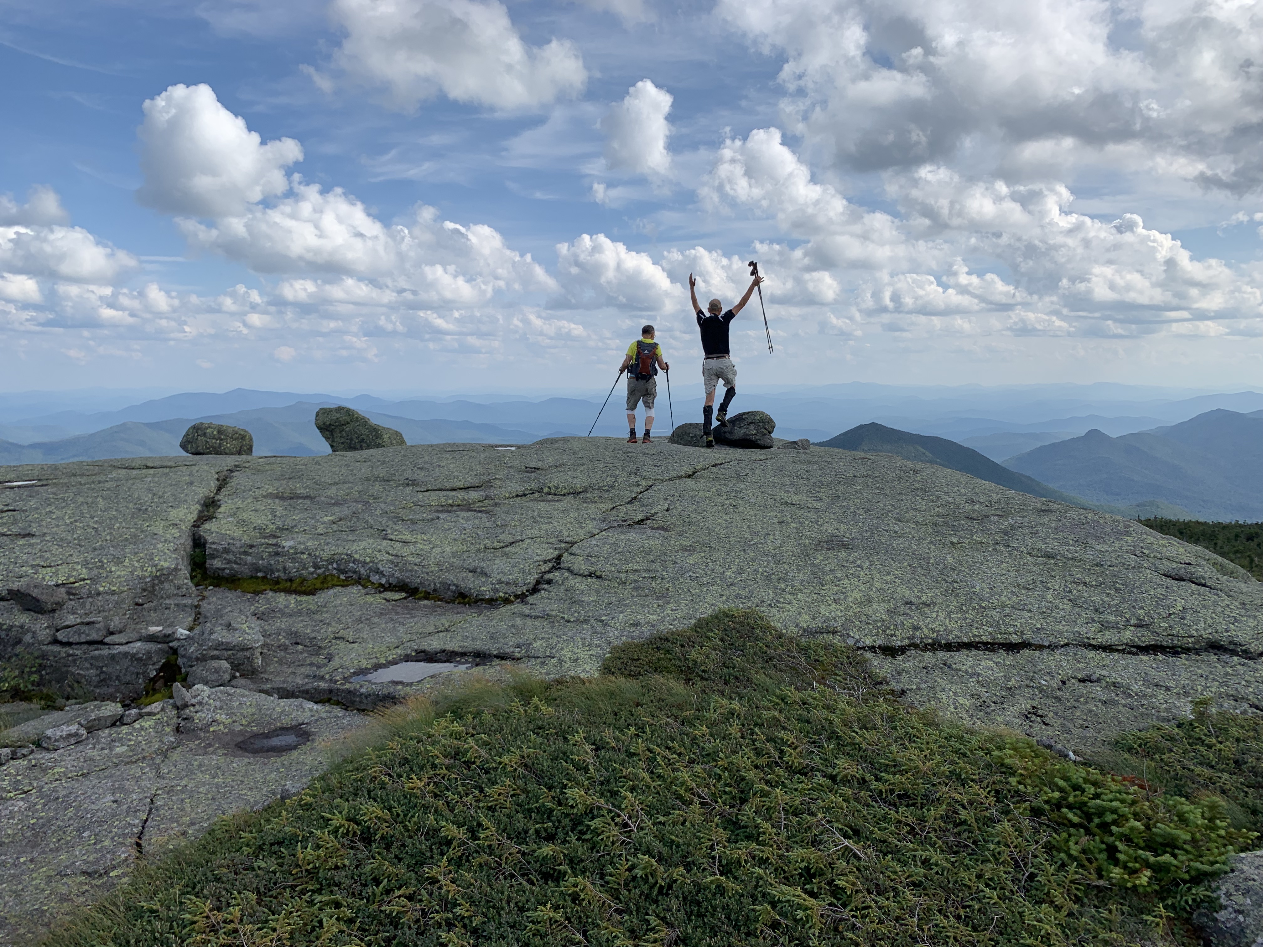 Thursday was beautiful, as close to perfect hiking weather as I’ve ever experienced. We made it up Gray (J&P’s #45), a delightful climb with surprises around every corner. Lake Tear of the Clouds, the highest pond in New York State, was bucolic perfection. We summited Skylight at 4:34 PM, making Jim and Paul virtual 46ers (the rules stipulate that candidates must also descend successfully.) The top of Skylight might be my favorite place on earth – wide open and expansive, with Marcy close enough to leap to, the Great Range over its shoulder, and the remaining 270 degrees packed with mountains and lakes. It might have been the bear stress, or lack of food and sleep, or maybe just sheer relief, but I sobbed for a few moments as I took it all in. Of course, watching Jim and Paul as they had their own moment was good for the spirit as well.