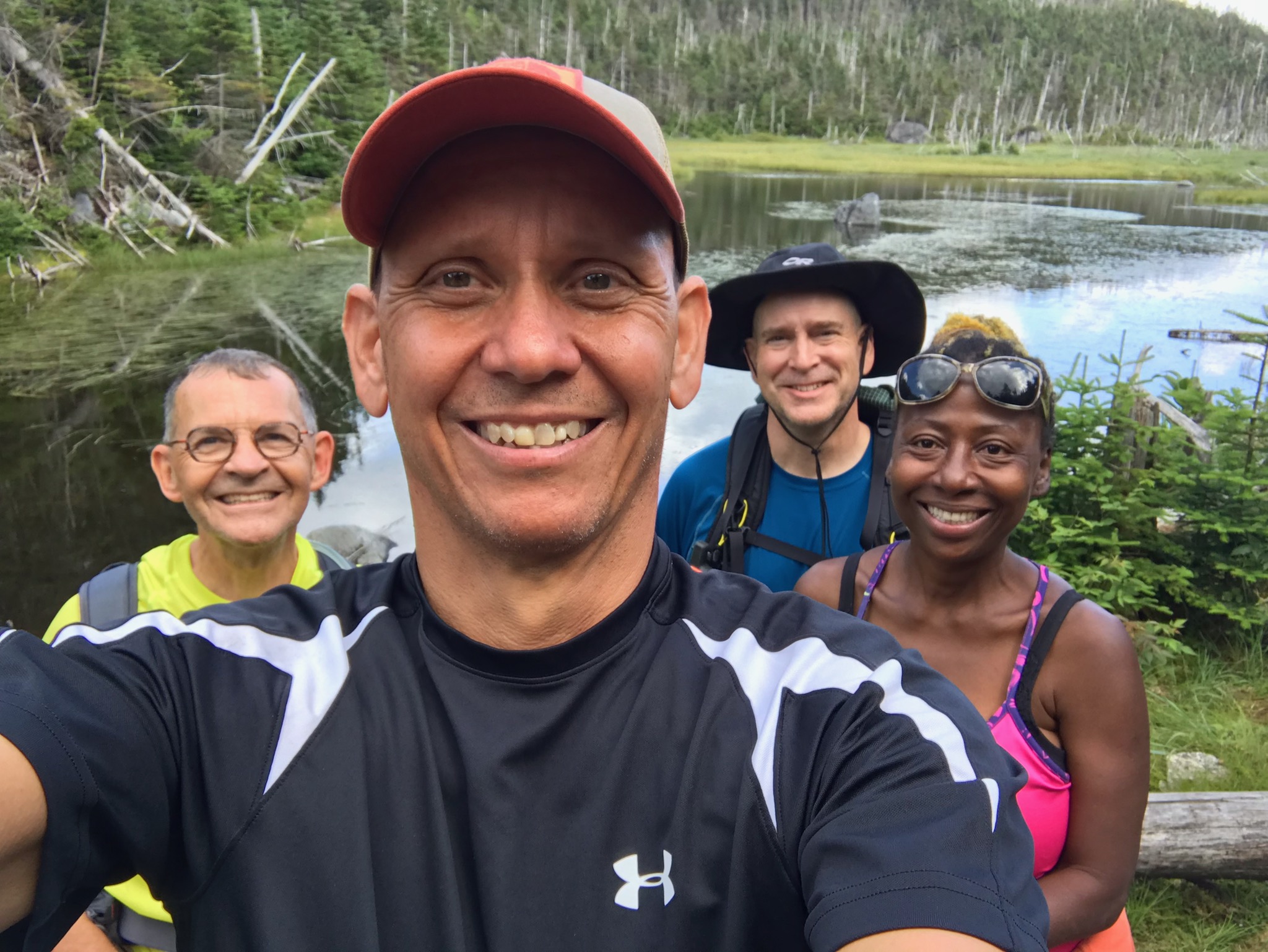 Henri hadn’t slept much either. She said there’d been a single loud cracking sound close by, as if a branch had been snapped by a large visitor, but that was all. It turns out, all you see from a lean-to at night is darkness – not much comfort when you’re looking for a black bear. We roused Jim and Paul, and together decided that since we’d made it through the night unmolested, it made sense to finish the 46er quest and sleep together in the lean-to that night. When two of the other tents left, we moved ours from their puddles to higher ground, intending to put them away later when they’d dried a bit. Cooking still seemed a risk, so we ate trail food.